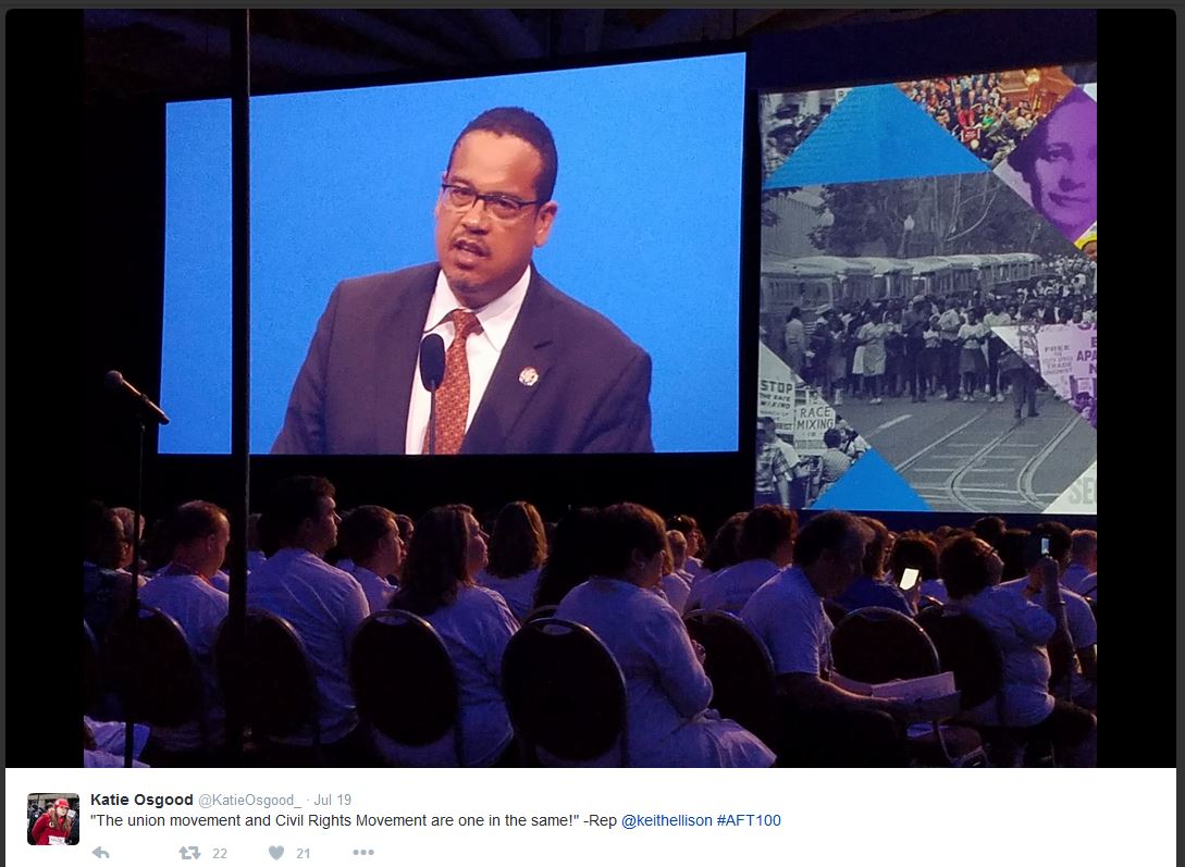 The action on human and civil rights didn’t end there, as there was a candlelight vigil for all victims of gun violence. Local activists took to the stage to express a call for a change in gun laws. One of the most compelling lines of the morning was when one speaker asked why it is illegal to hunt animals with assault rifles but legal in some states to use them on people. That line drew a rousing applause from the entire hall.Congressman Keith Ellison also spoke to the crowd. He expressed frustration over the nuance that is often lacking around conversations about race. He lauded AFT’s history of racial inclusiveness over its 100 years. He also expressed how Black Lives Matter isn’t an indictment of any other group or discounting of anyone else, but rather an affirmation of the value of black Americans.