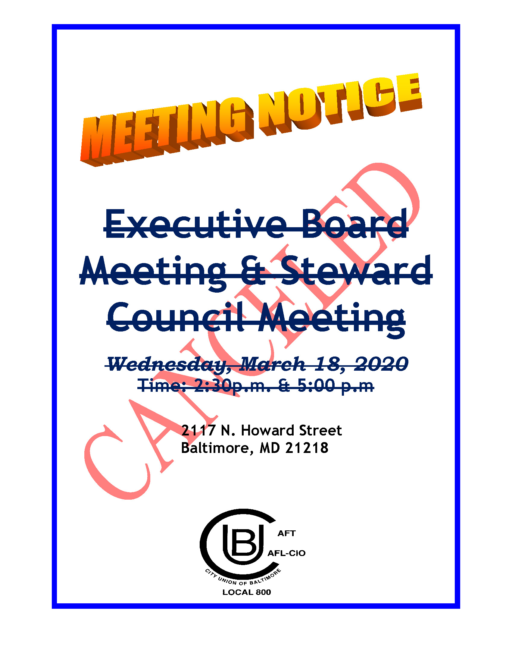 Meeting Notice: The Executive Board Meeting and Steward Council Meeting scheduled for Wednesday, March 18, 2020 at 2:30p.m. and 5:00 p.m. have been CANCELLED.